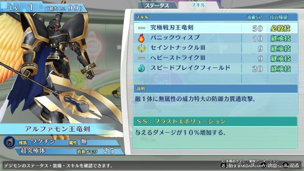 ポケモンみたいに努力値とか個体値みたいなものが無いので、レベル99のステータスはそのデジモンごとに同じです。